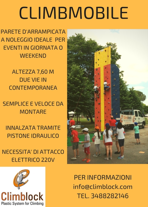 Proponiamo per il noleggio diverse soluzioni su misura, torri autoportanti, parete boulder oppure la nostra Climbmobile, la soluzione migliore per i noleggi in giornata